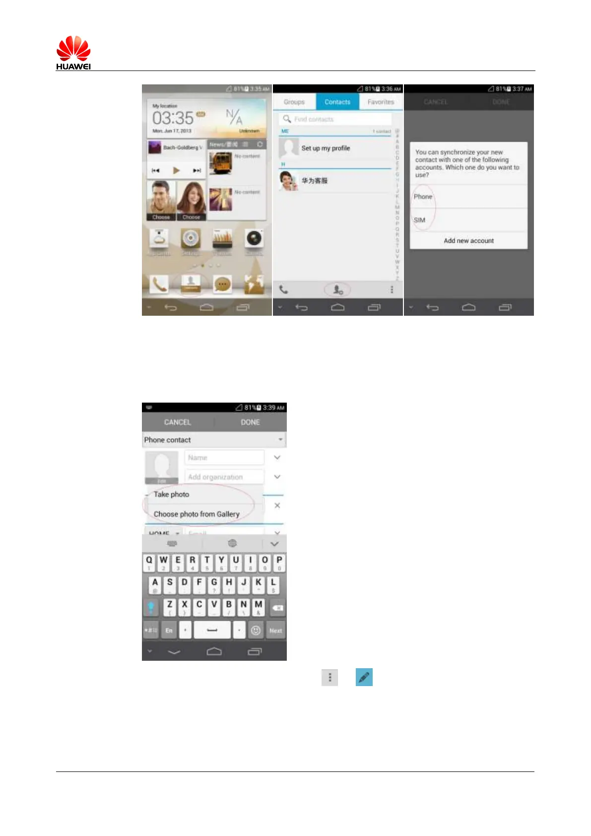 contact details screen, touch the contact photo area and then Take photo or Choose