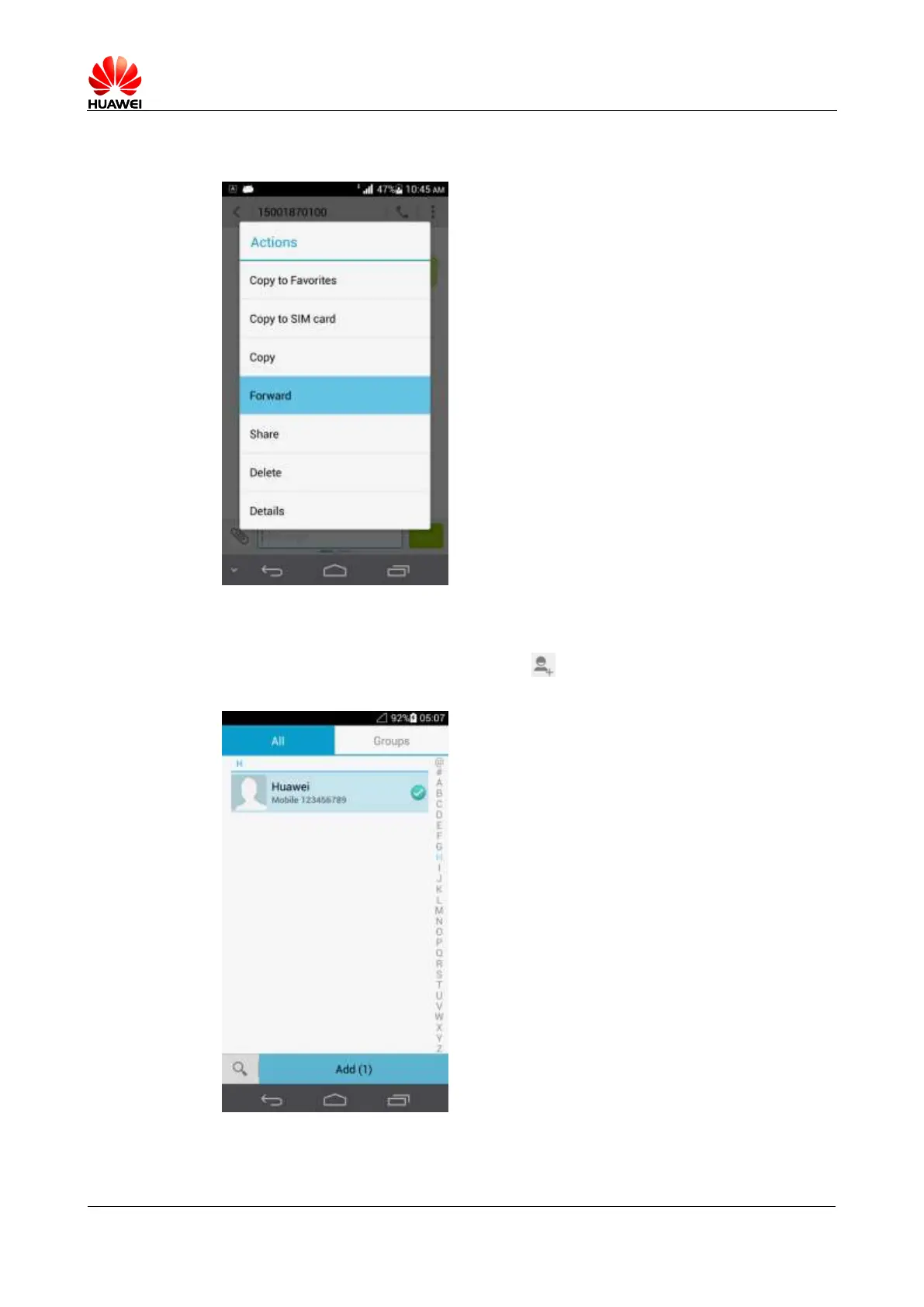 Touch and hold a message, choose Forward from the displayed option menu, and choose a