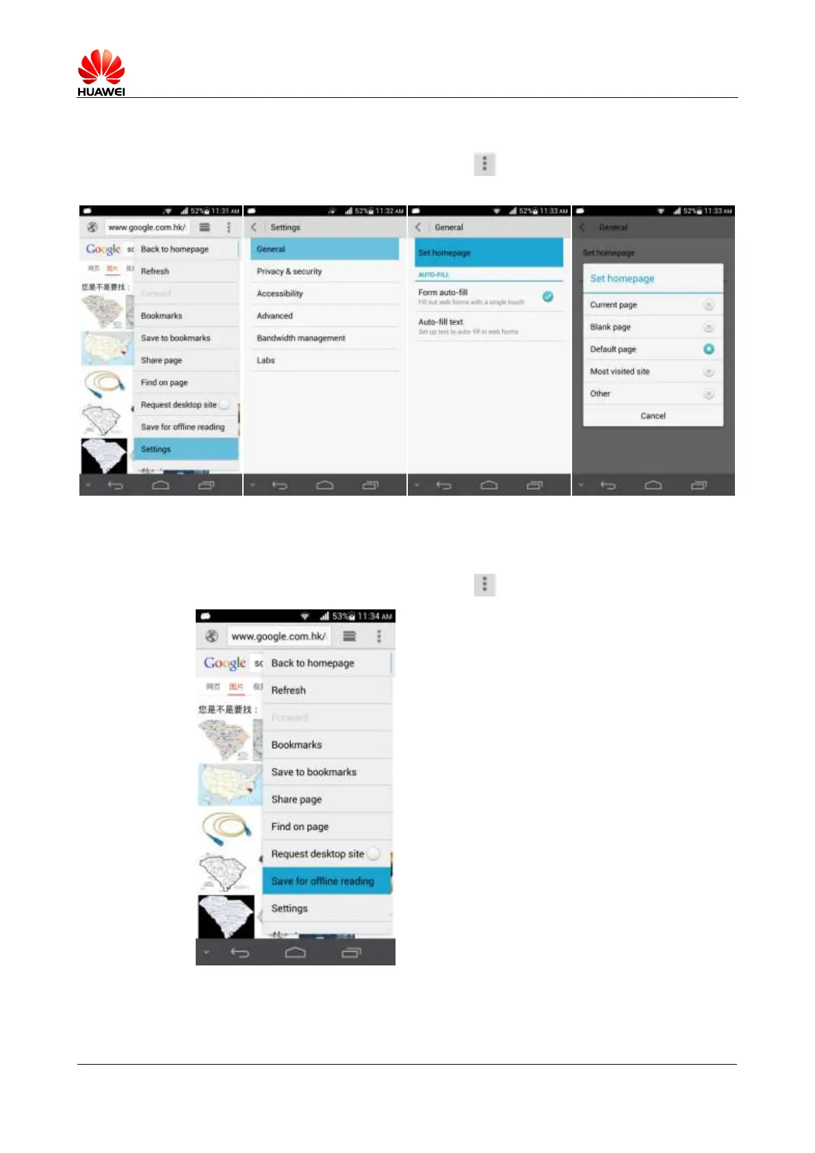 On the browser screen, open a web page, touch > Settings > General > Set homepage,