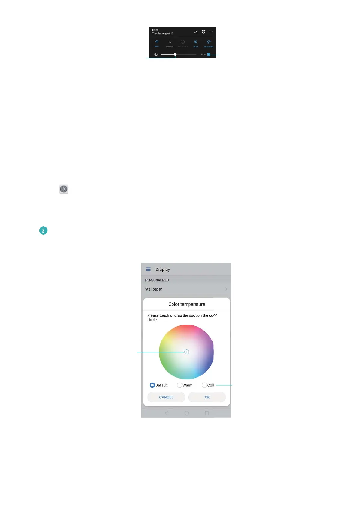 ouch Display > Color temperature. Select Default. Warm, or Cold, and then touch OK to