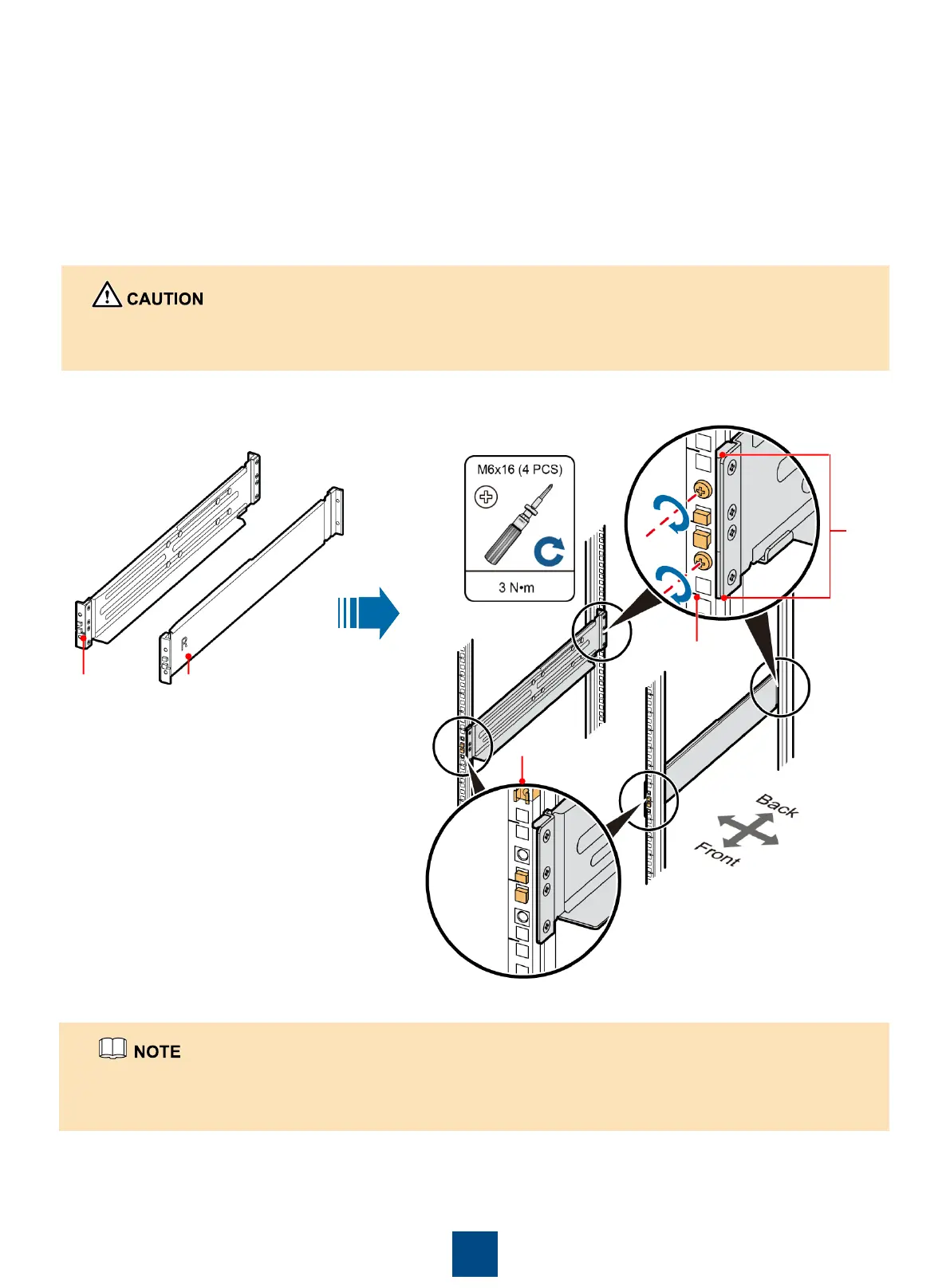 C. Install floating nuts in the upper part of the guide rails (front side) on both sides. The following figure shows