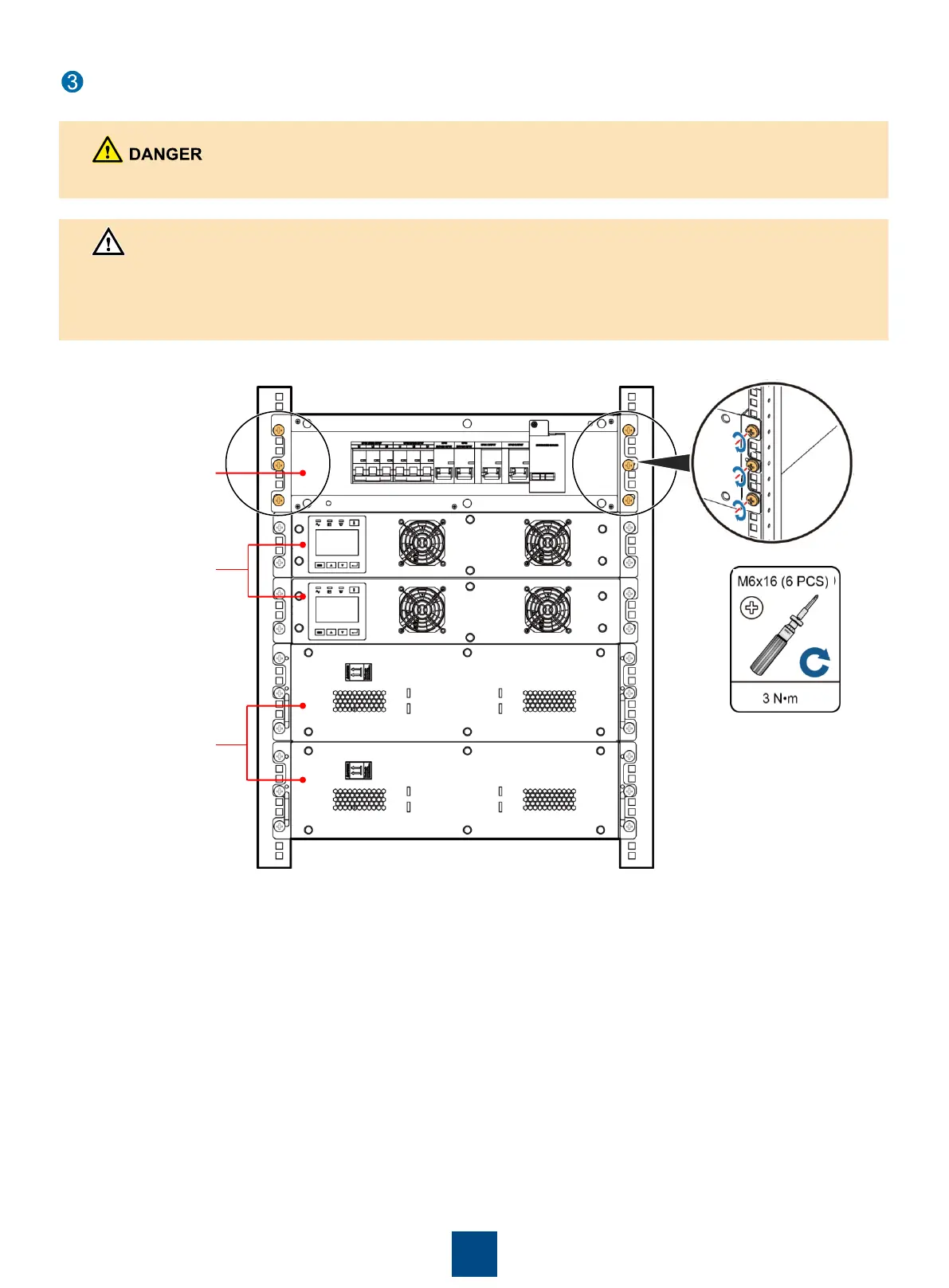 Place the PDU on the guide rails. Secure the PDU to the rack using M6 x 16TM screws through the holes in the mounting