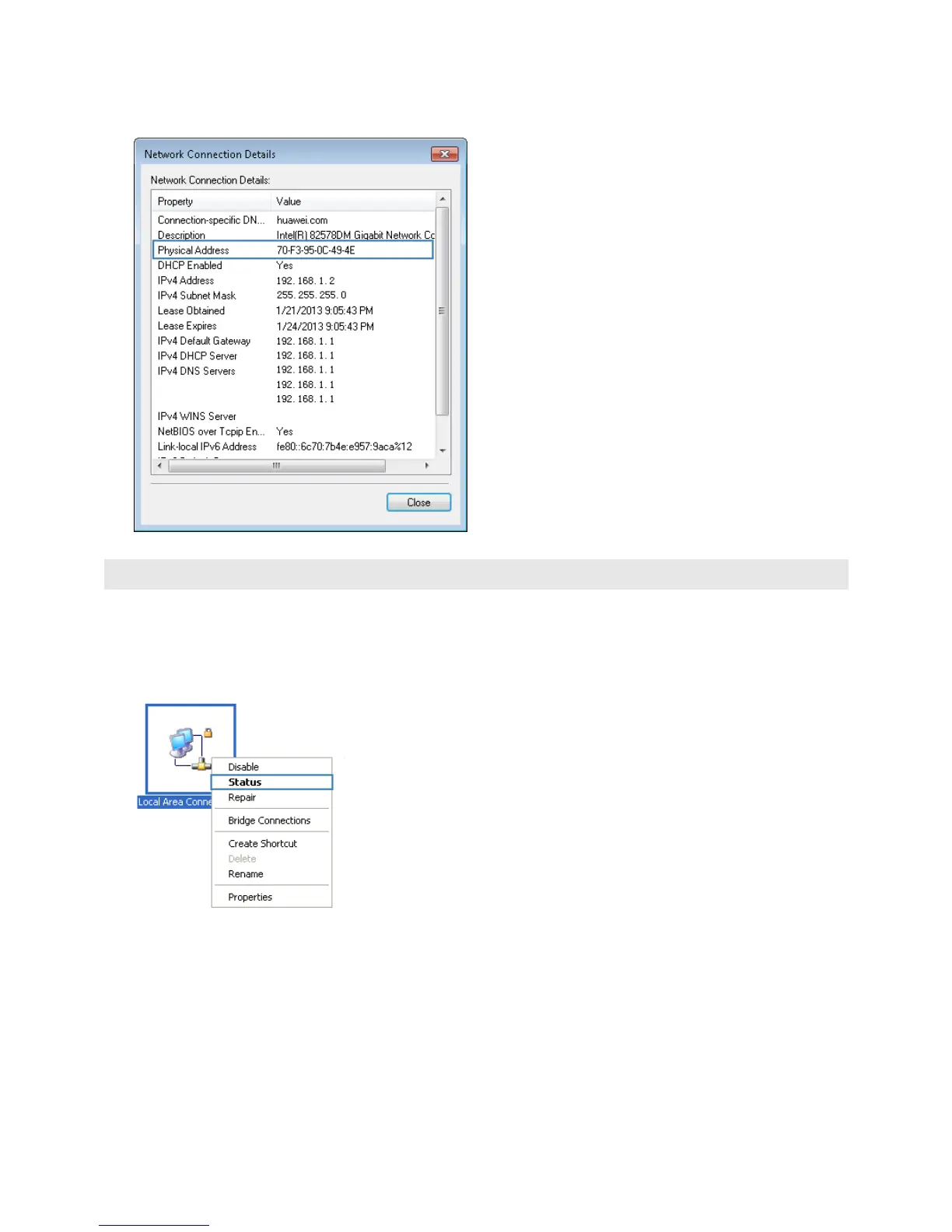 Connections. Right-click Local Area Connection and choose Status from the shortcut