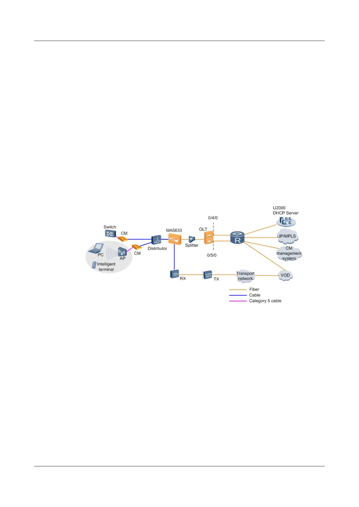 As shown in Figure 16-13, an MA5633 is deployed on an optical node and CMs are deployed