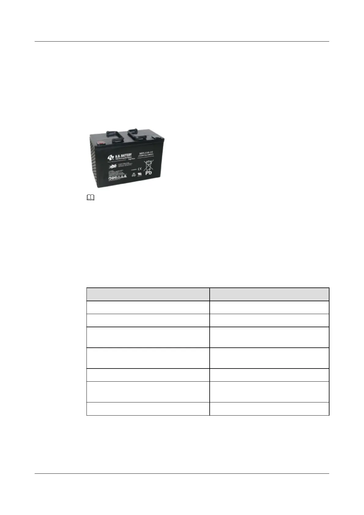 Table 6-40 lists the specifications of the 100 Ah battery.