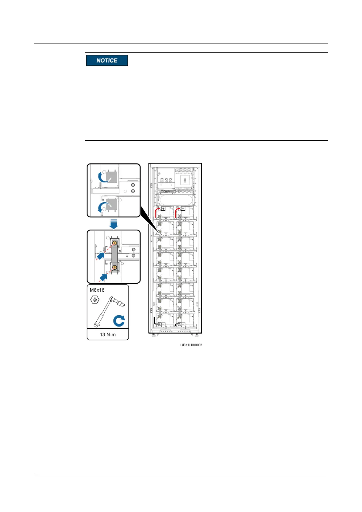 Connect the round hole of the copper bar to the upper battery module, and then connect