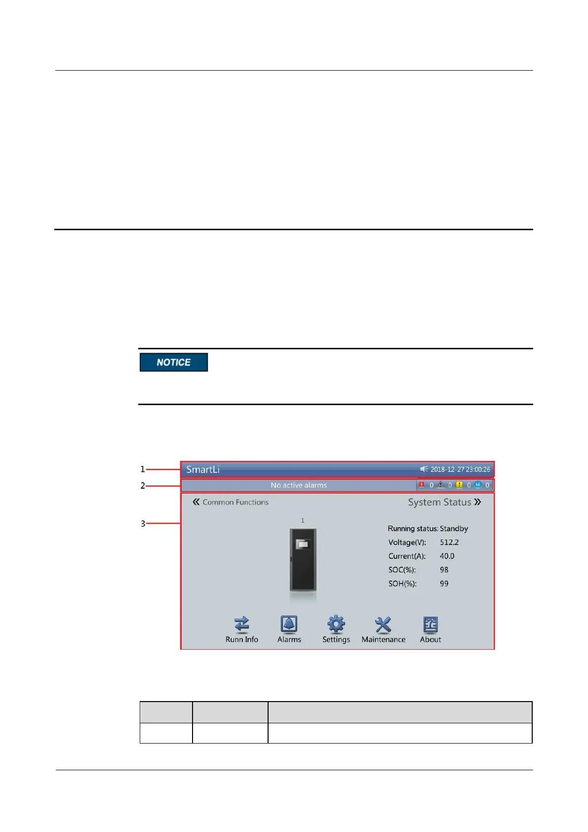 The LCD screen is divided into three parts: status bar, alarm bar and information area.