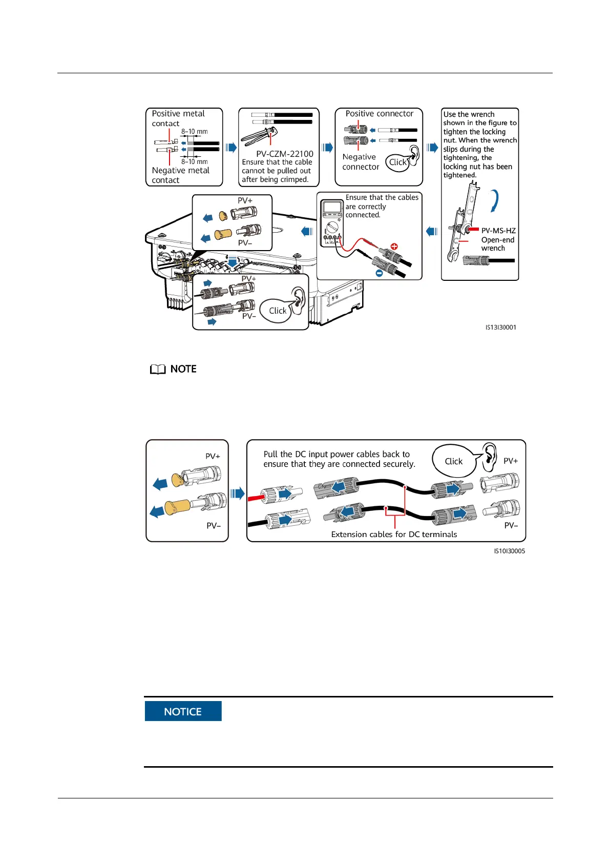 If the original DC input power cables are not long enough, use the DC input extension cables delivered