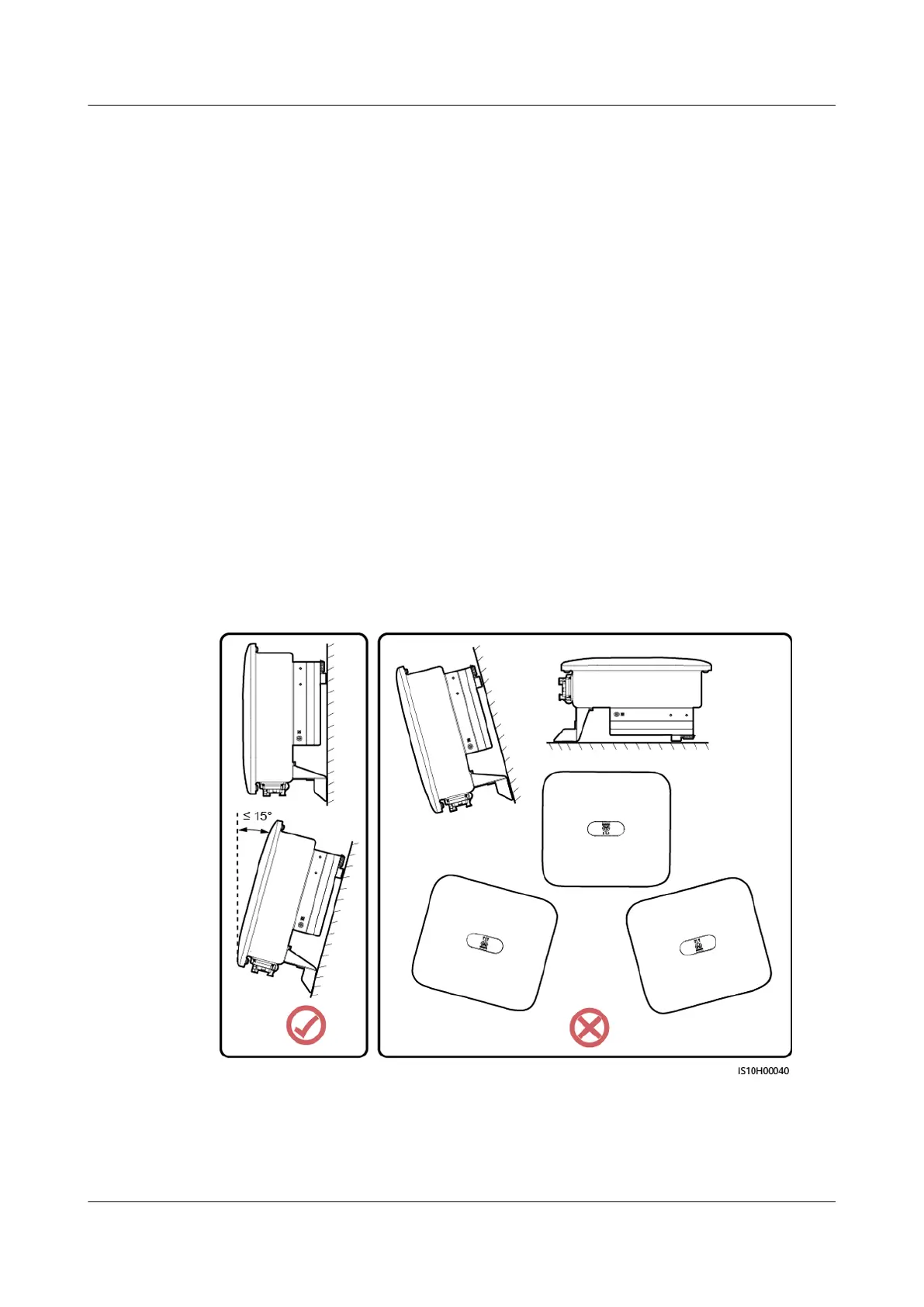 Do not install the SUN2000 at forward tilted, excessive back tilted, side tilted,
