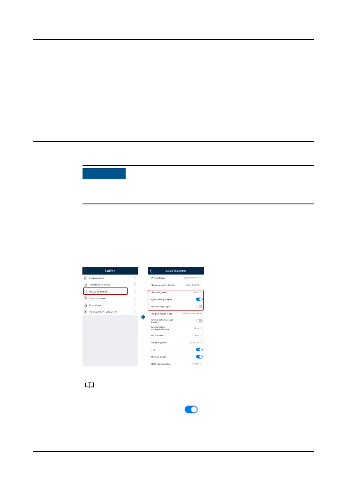 ● Set Nighttime o-grid repair to . (This parameter is displayed when Built-in