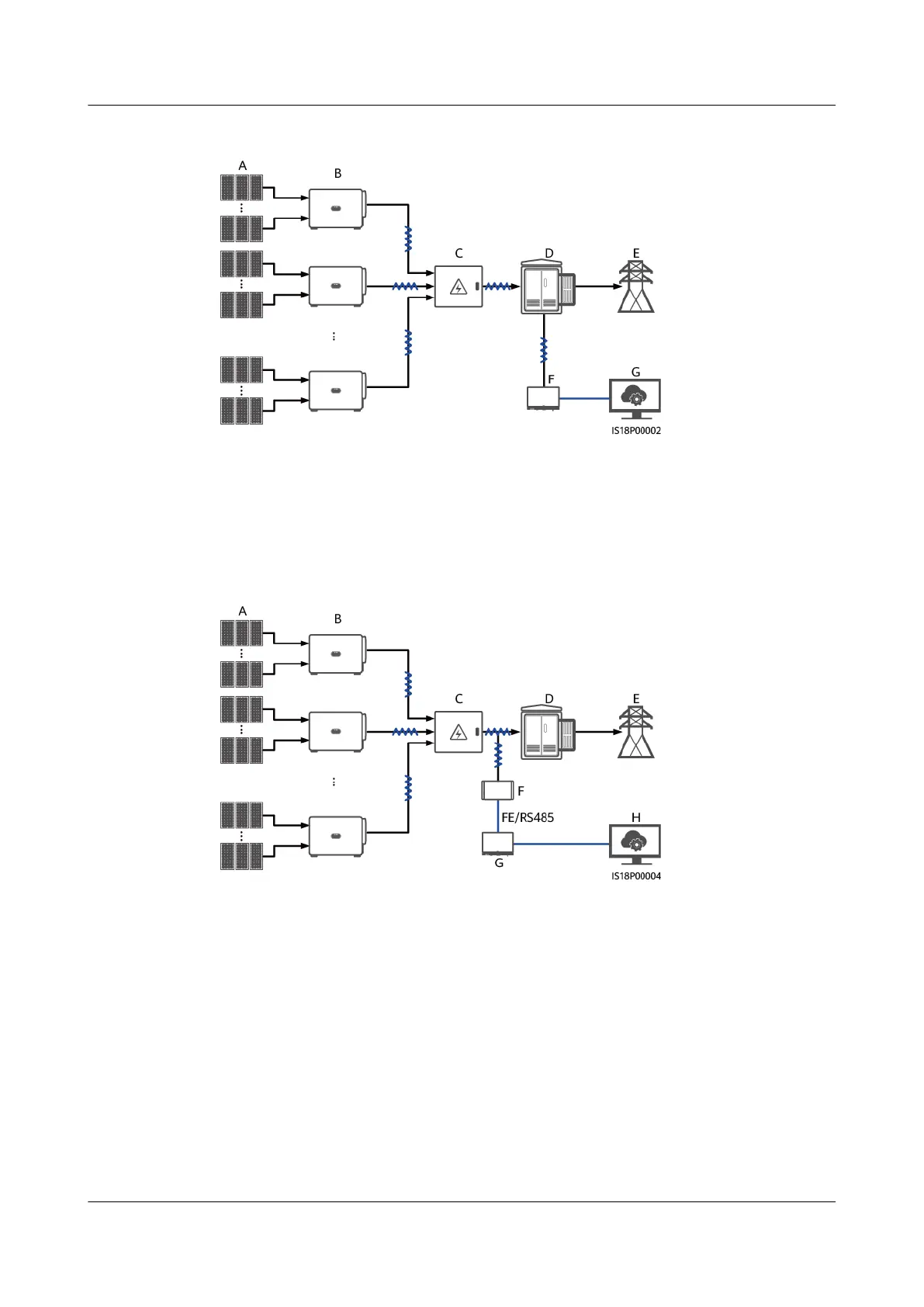 (A) PV strings (B) SUN2000s (C) AC combiner box