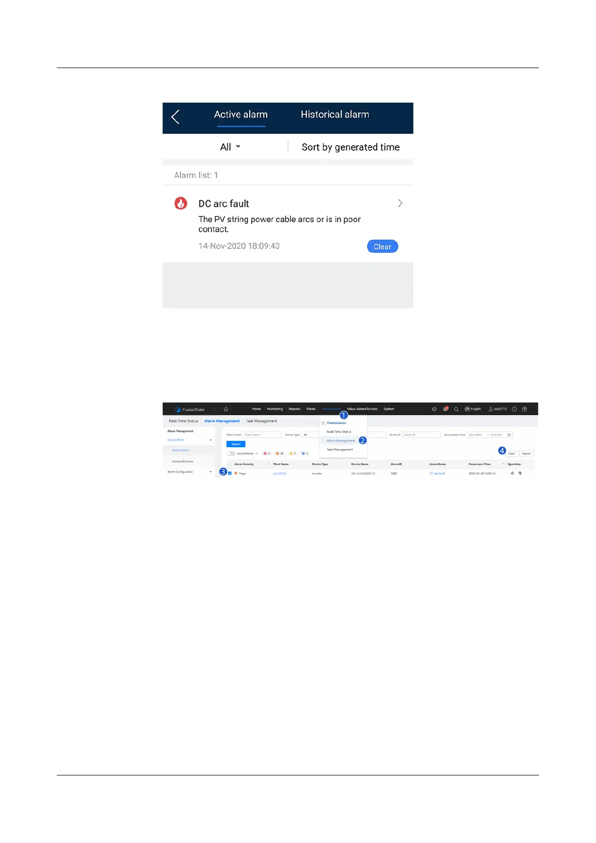 account, choose Maintenance > Alarm Management, select the DC arc fault