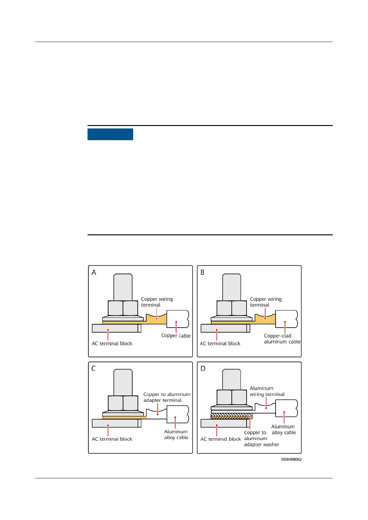 ● Do not connect aluminum wiring terminals to the AC terminal block. Otherwise