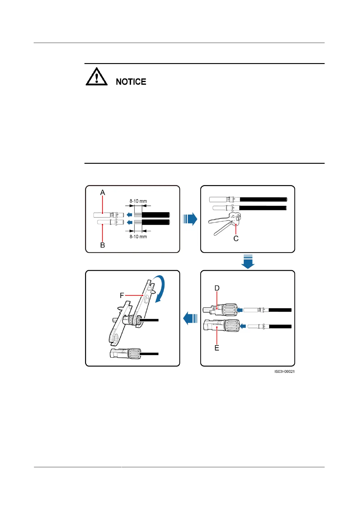 Before assembling DC input connectors, label the cable polarities correctly to ensure