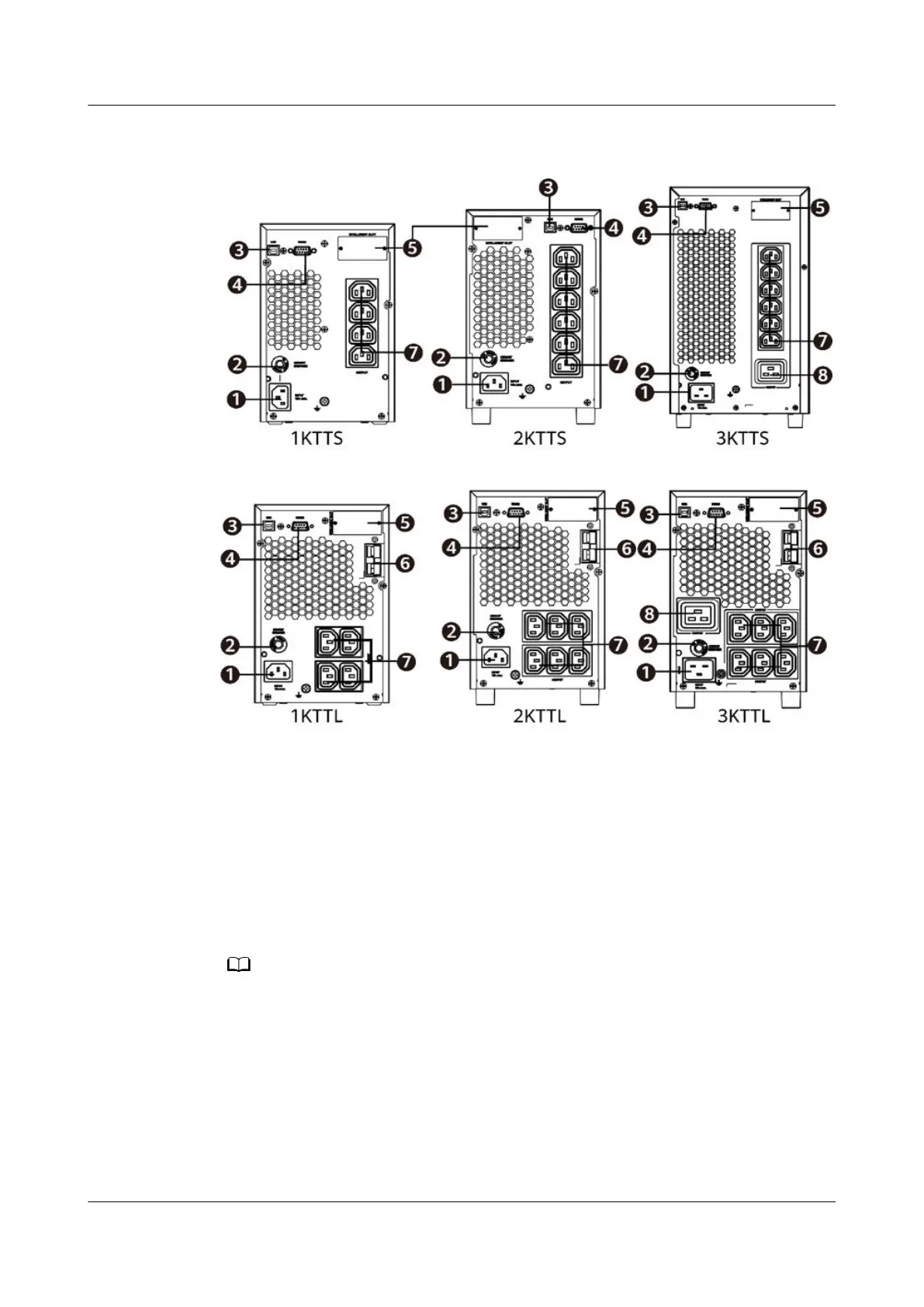 Figure 2-3 Rear views of UPSs with standard backup time and and long backup
