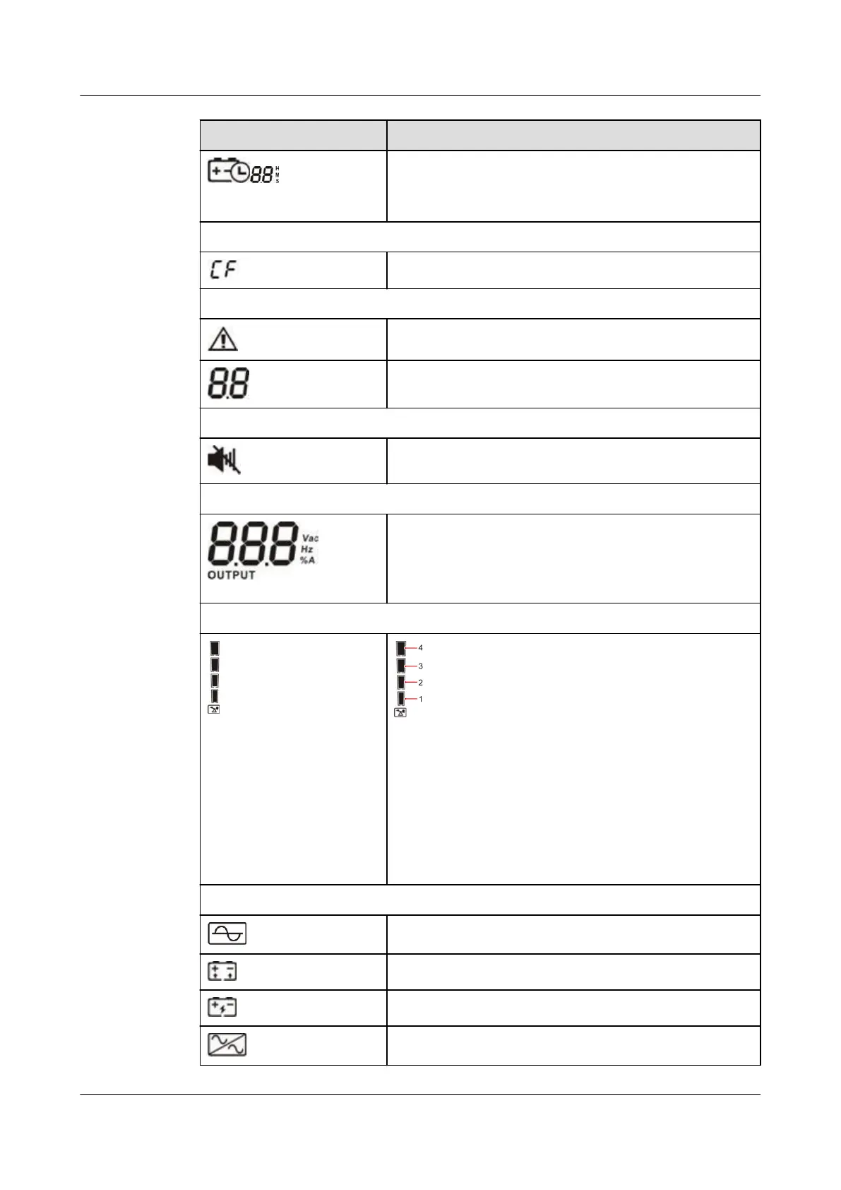 Displays the output voltage, frequency, or battery