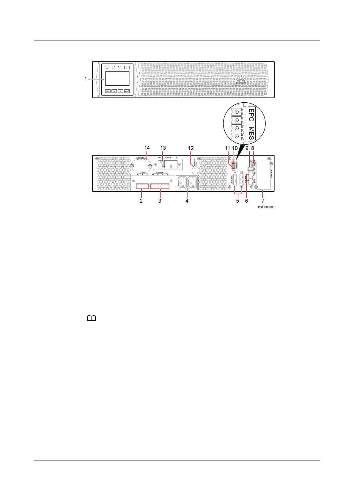 Figure 2-3 Front and rear views of the UPS2000-G-6 kVA