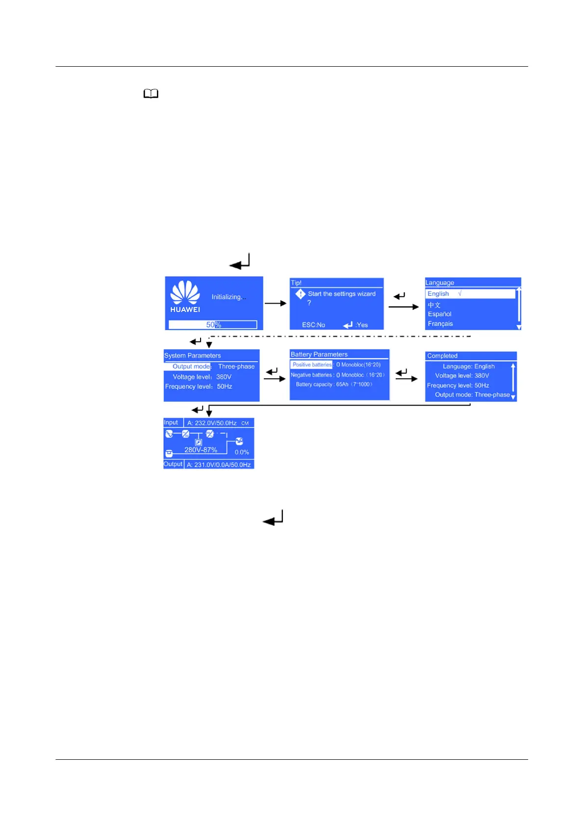 English), system parameters, and battery parameters. After you complete the
