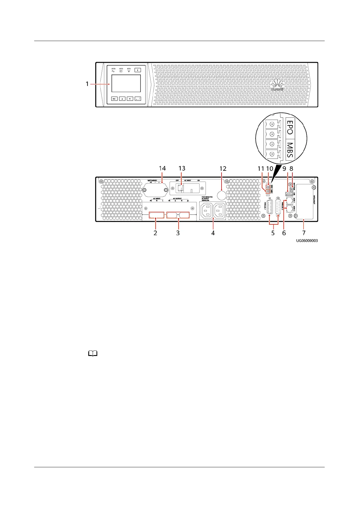 Figure 2-3 Front and rear views of the UPS2000-G-6 kVA