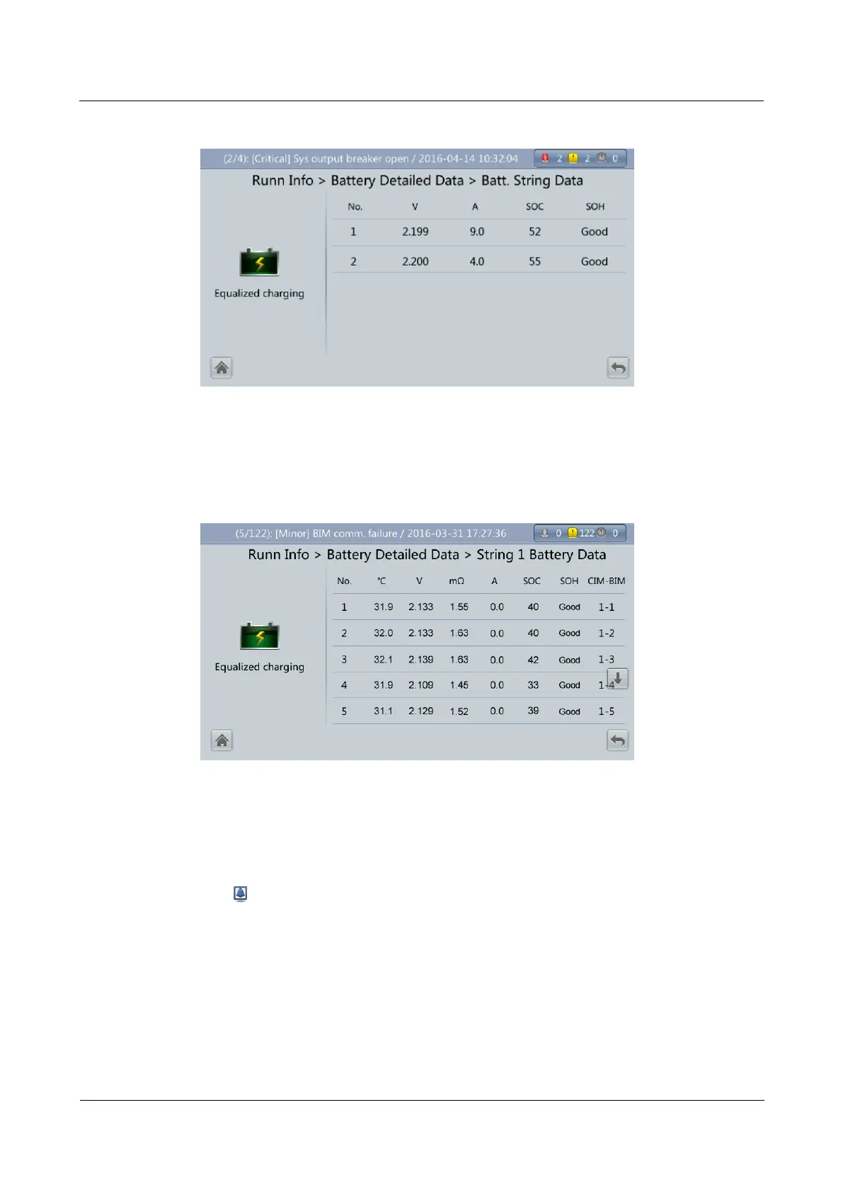 This screen displays the voltages, currents, SOC, and SOH of each battery string.