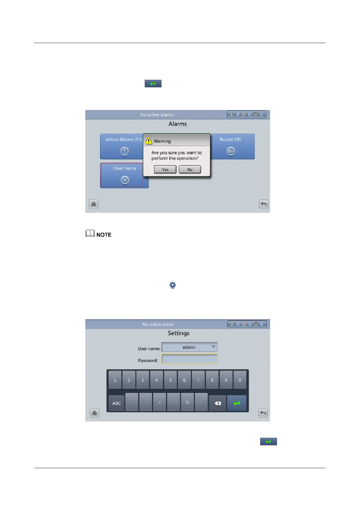 Tap Clear Faults. If you have not logged in, a login screen is displayed. Enter a user name