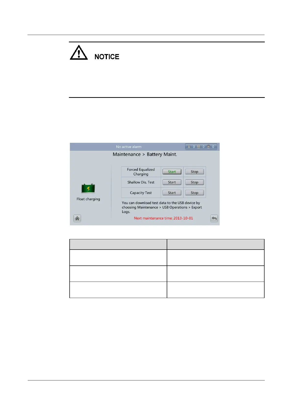 Perform battery maintenance when no alarm is active on the UPS. Otherwise, the UPS