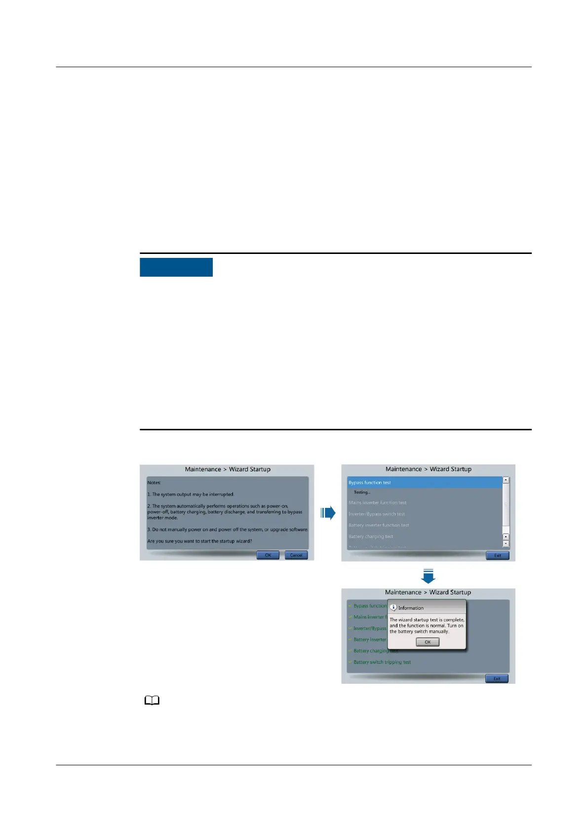 The wizard startup can be used to test the bypass, mains inverter, inverter/bypass