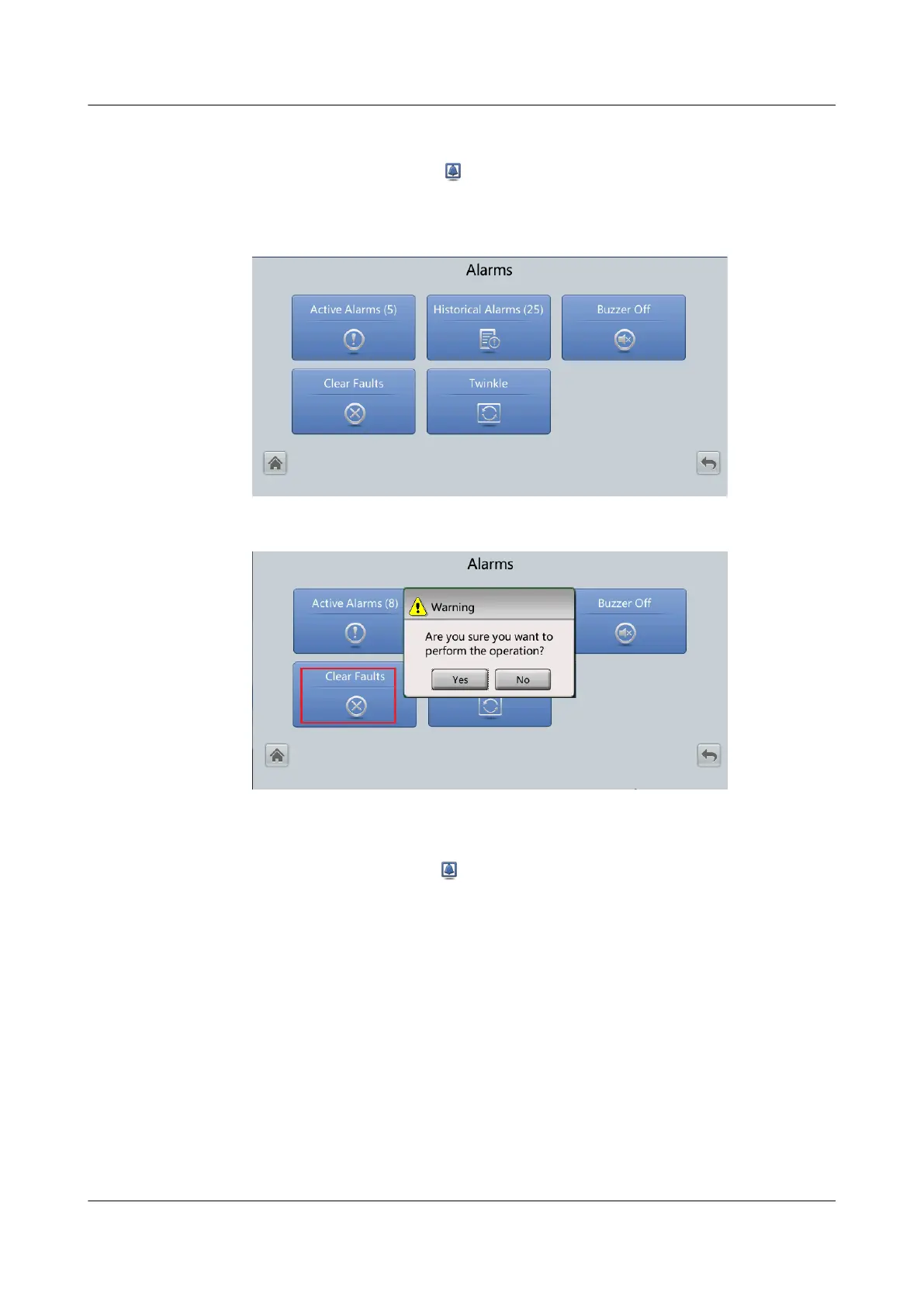 ● Choose System Info, tap to enter the Alarms screen, and tap Clear Fault.