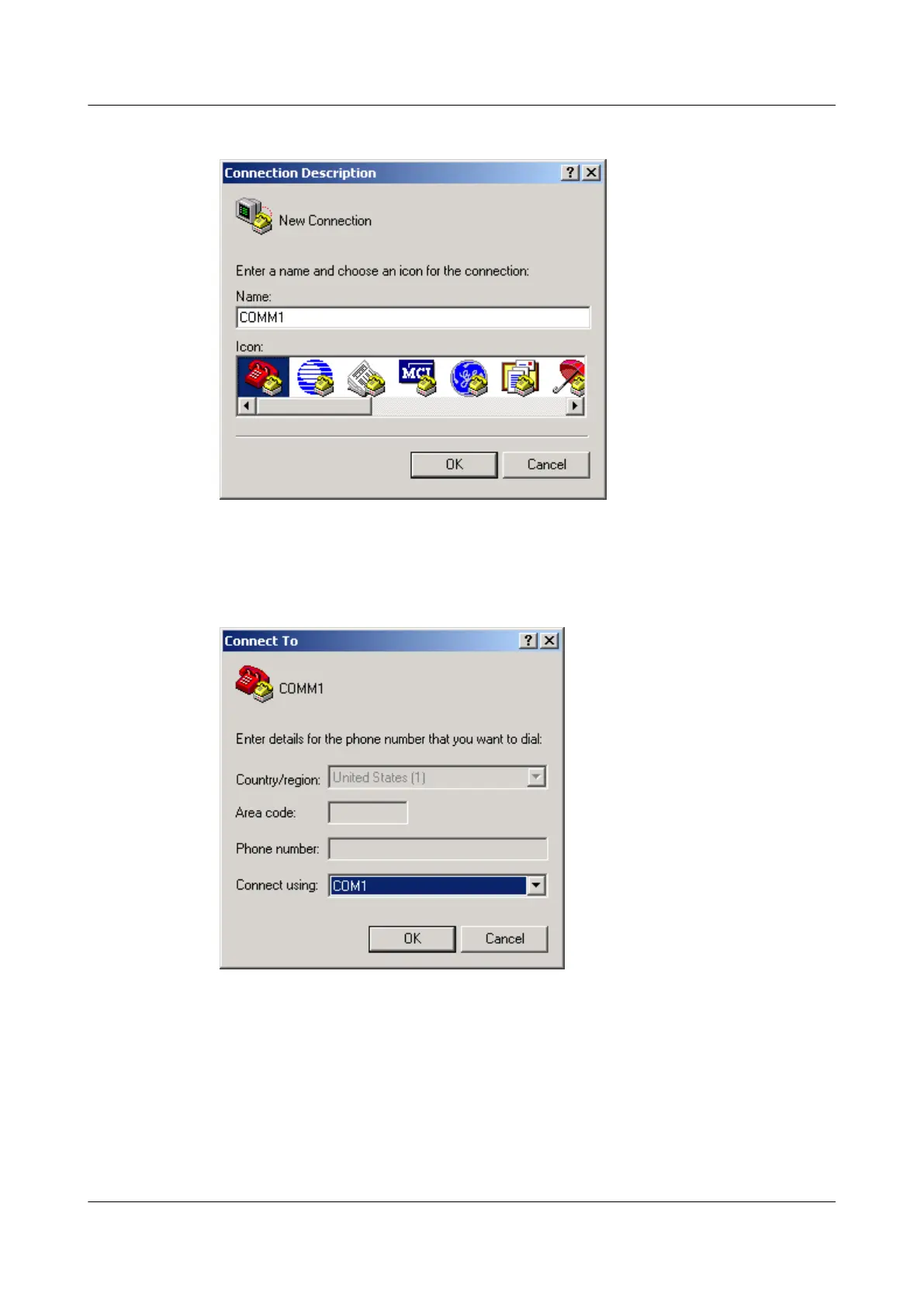 Step 2 Click OK and the Connect to dialog box is displayed. Select the serial port (such as COM1)