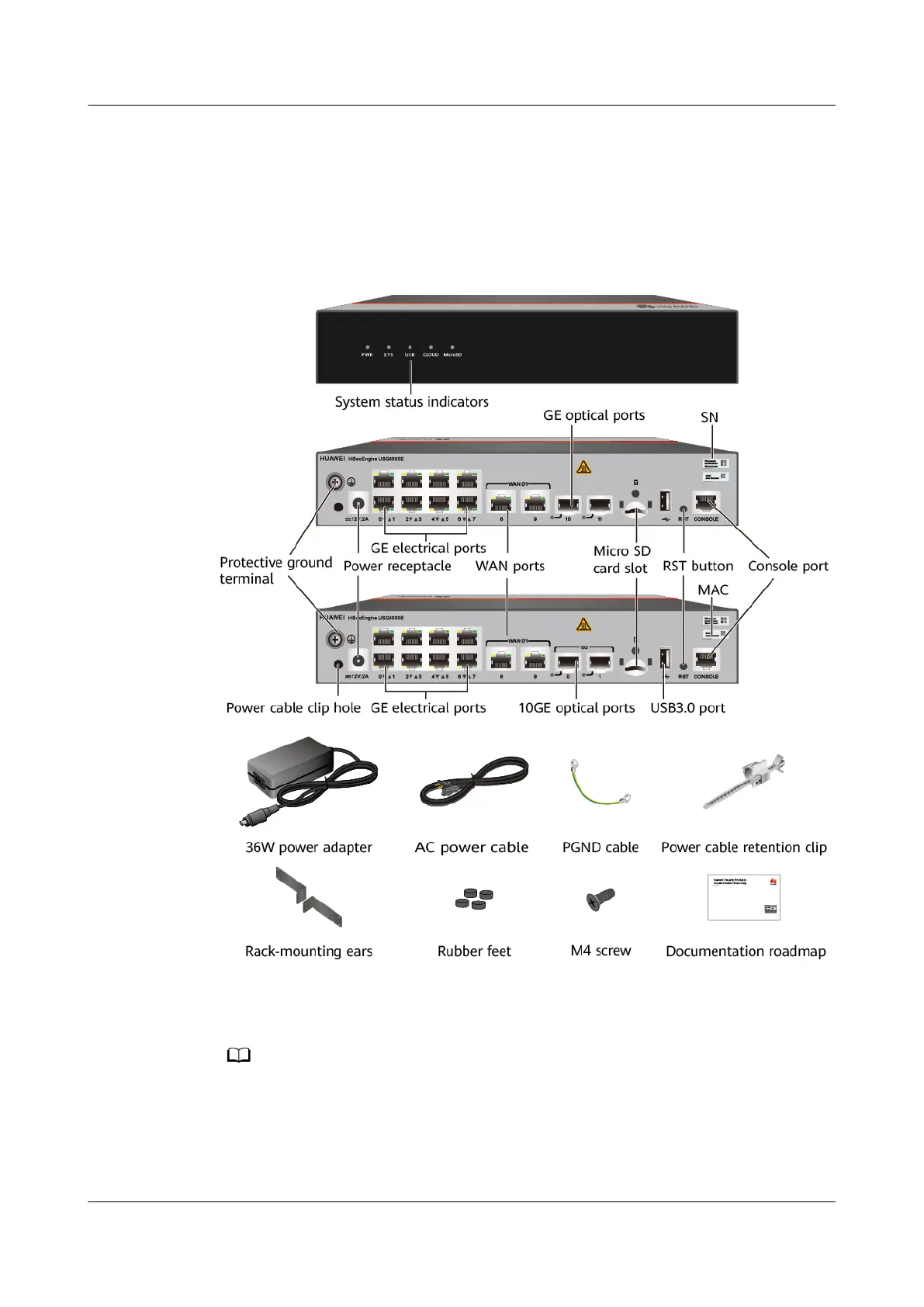 Figure 2-1 Appearance and auxiliary materials of the USG6510E, USG6530E