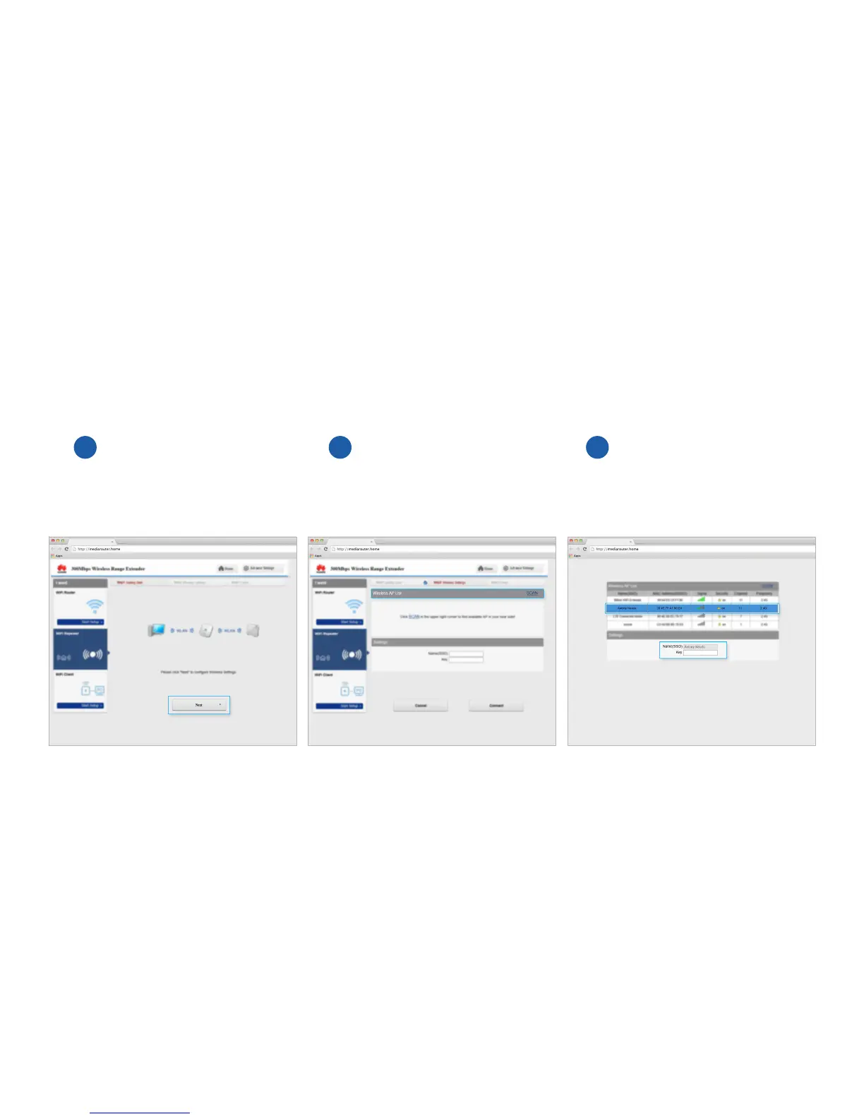 Huawei Wi-Fi Extender - Configure Wi-Fi Repeater Settings; Confirm Repeater Selection; Scan for Wi-Fi Networks; Enter Network Credentials