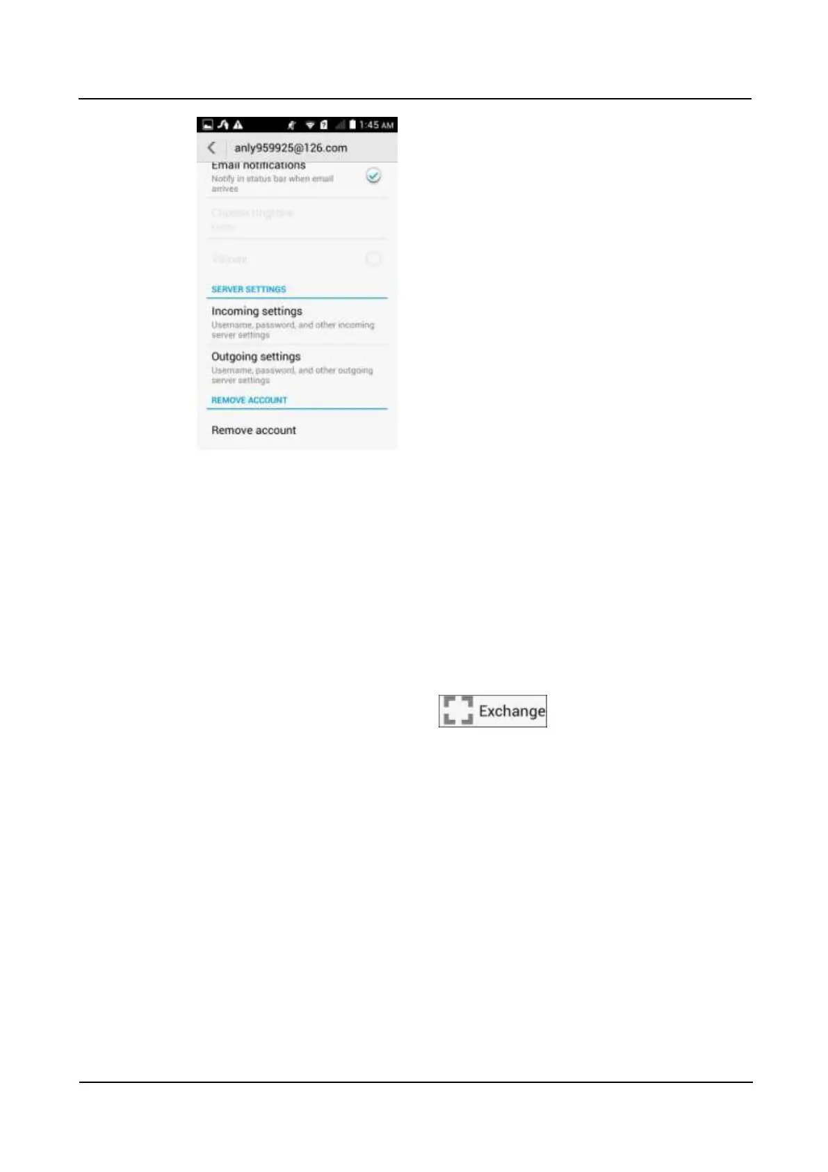 On the NEW ACCOUNT screen, touch . Obtain the email box server's