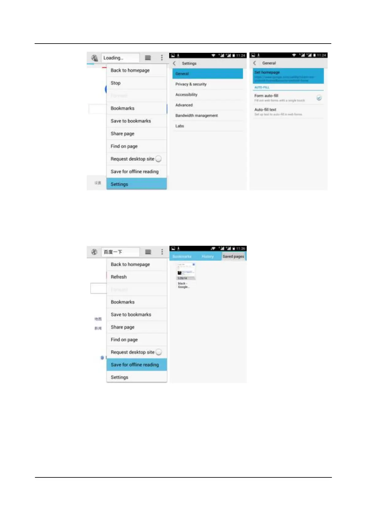 Open a web page. Touch the menu key. From the displayed option menu, choose Save for