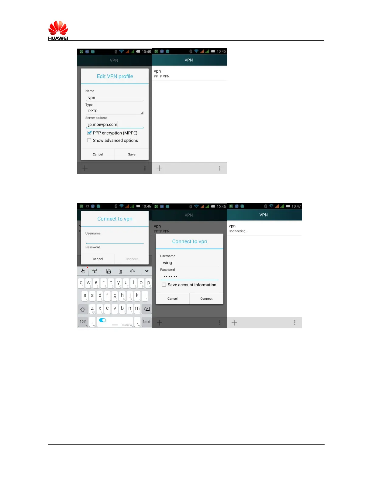 Step4, touch “vpn”, and enter username and password, touch connect, if succeed, it will show