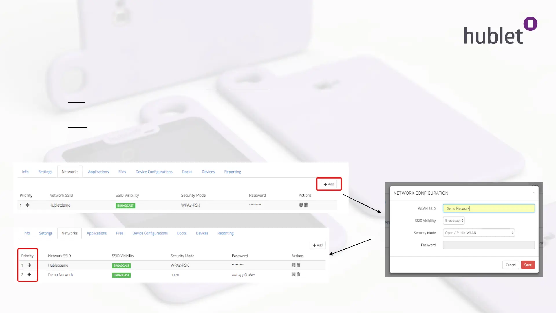 The Networks tab let’s you define the allowed networks for your tablets. Hublet supports Open, WPA, WPA2