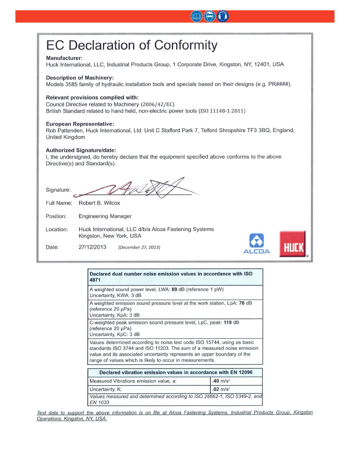 Huck 3585 - EC Declaration of Conformity; Noise Emission Values; Vibration Emission Values