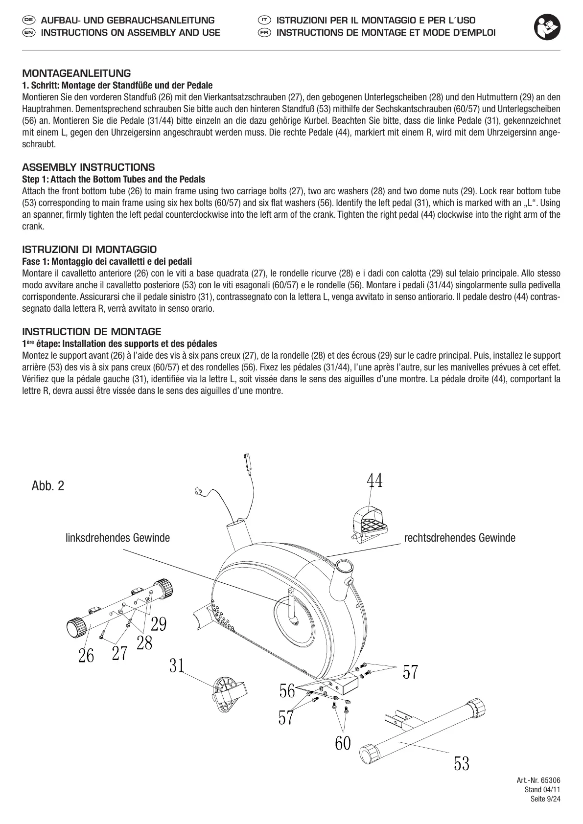 (56) an. Montieren Sie die Pedale (31/44) bitte einzeln an die dazu gehörige Kurbel. Beachten Sie bitte, dass die linke Pedale (31), gekennzeichnet