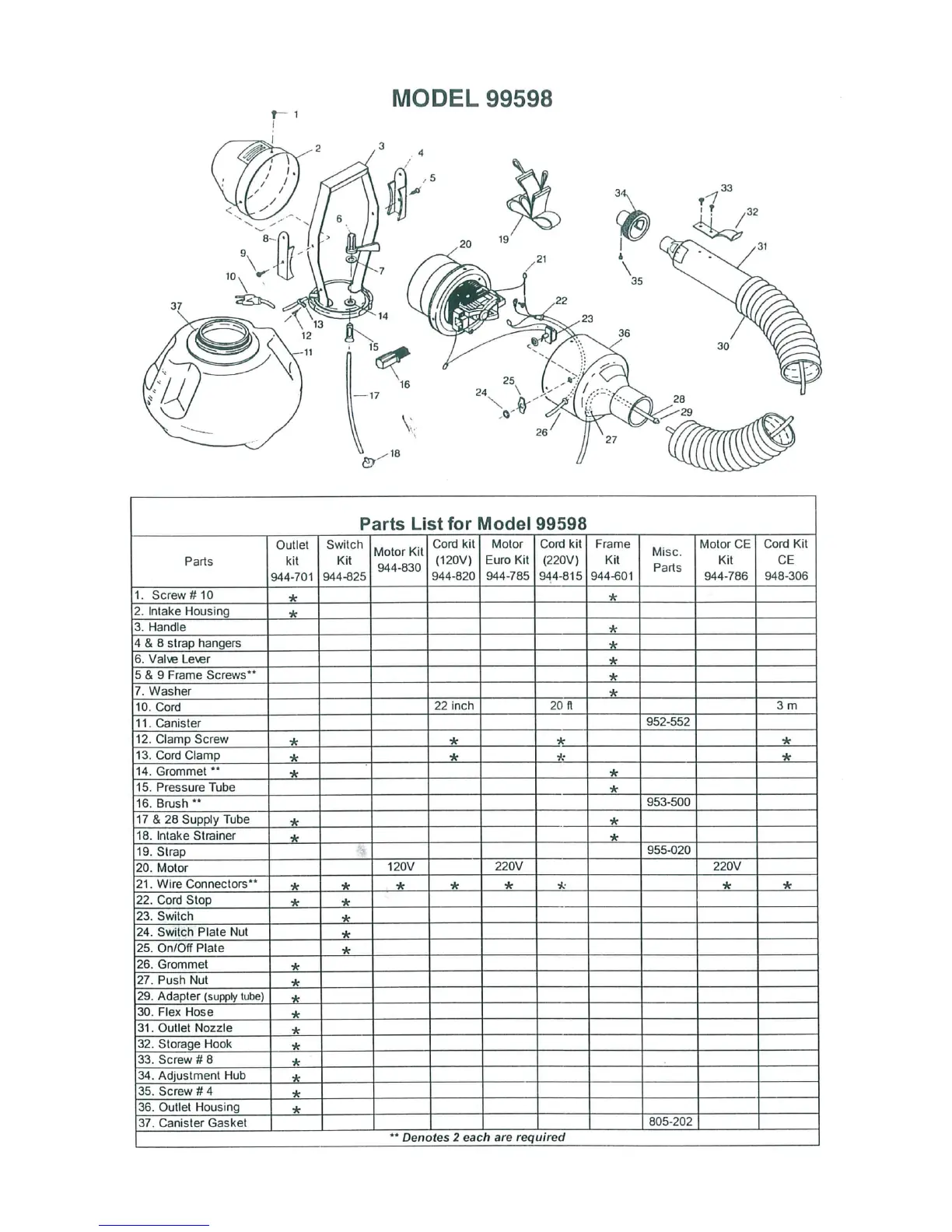 Hudson 99598 - Parts Lists and Diagrams; Model 99598 Parts List