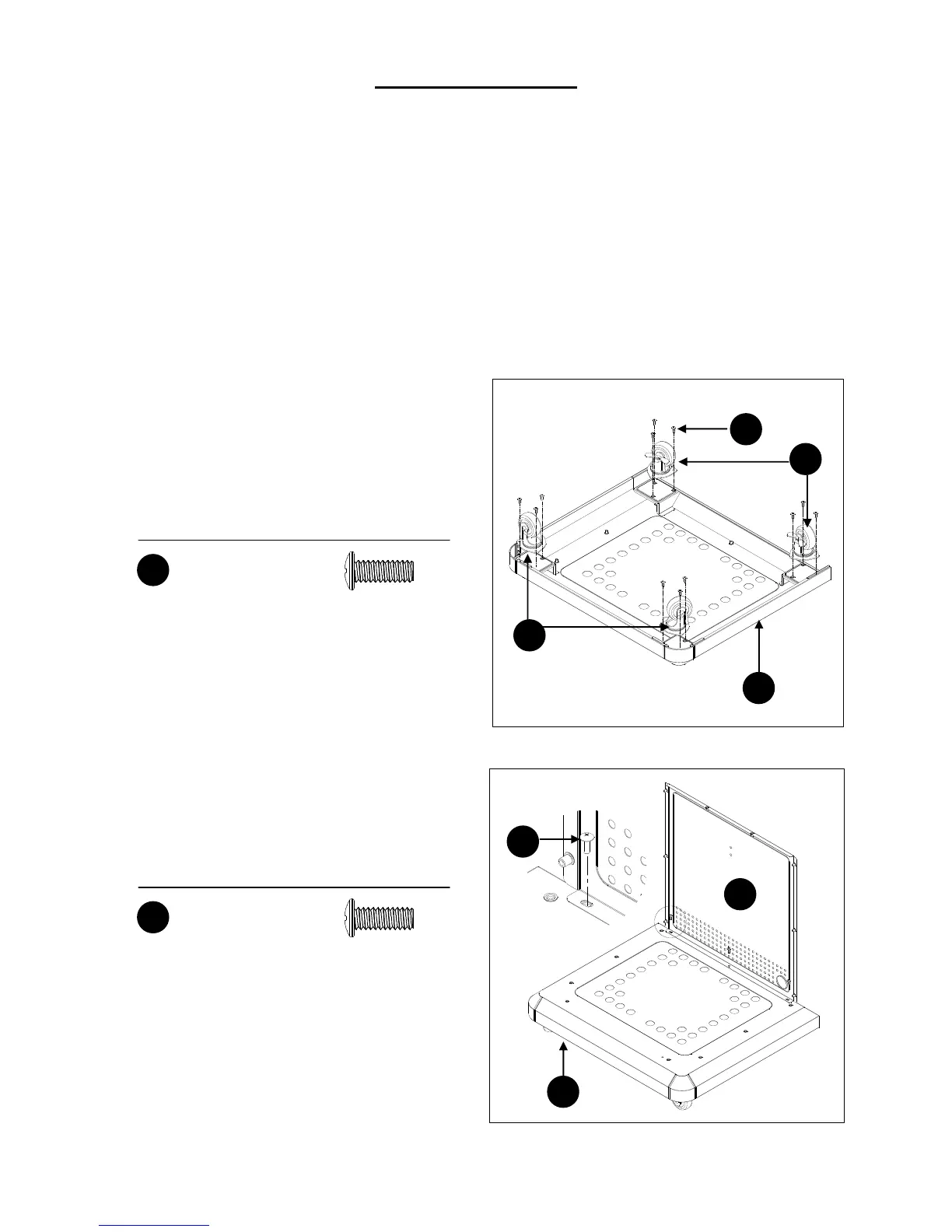1. Attach the locking casters (Q) and the casters (R) to
