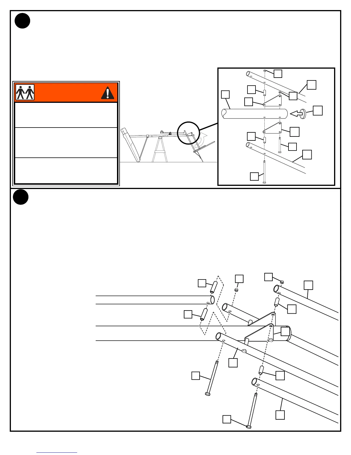 Die Stange auf einen Sägebock legen. Die Korbwandbaugruppe wie gezeigt am oberen Stangenteil (4) befestigen.