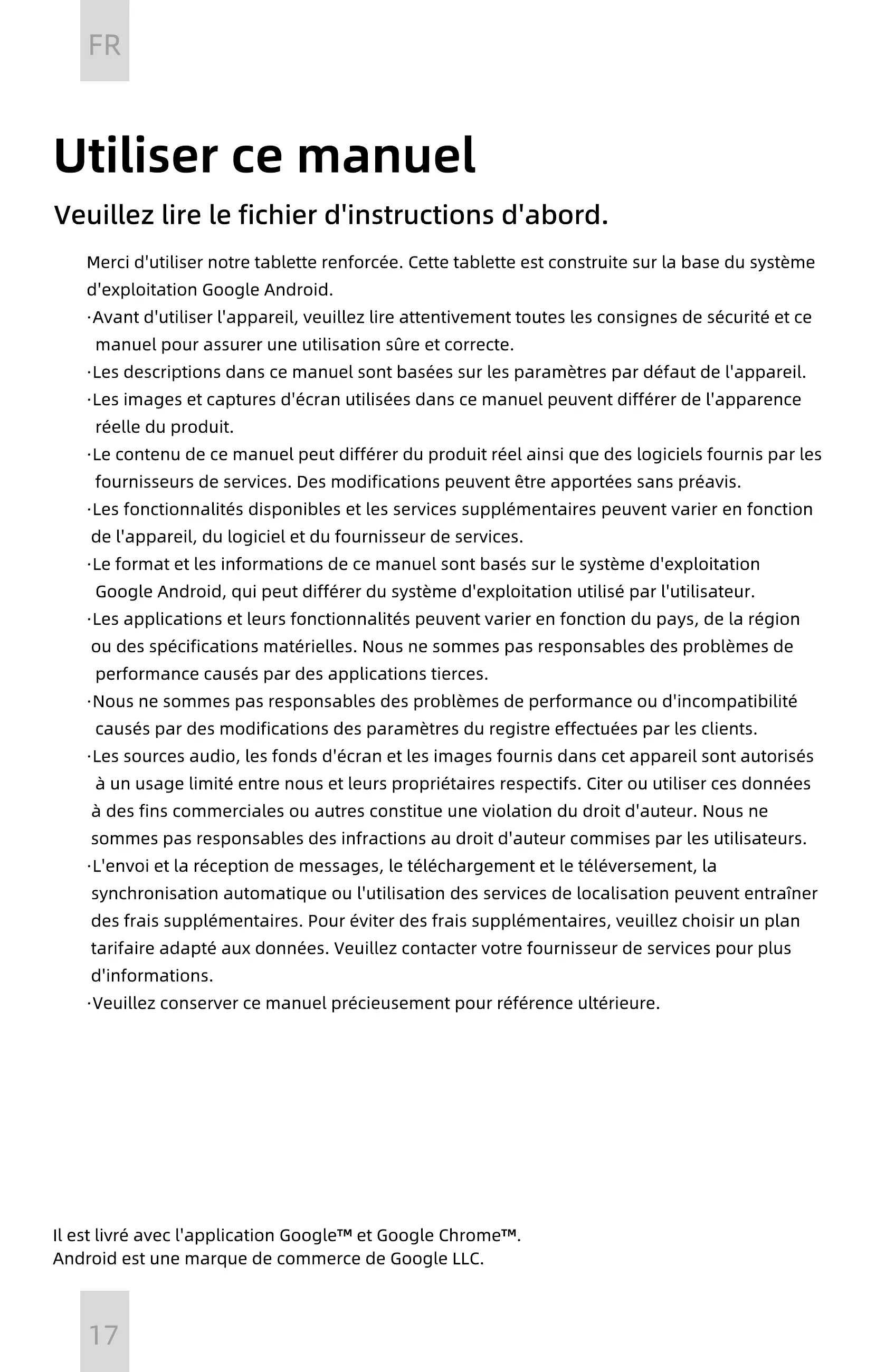 Merci d'utiliser notre tablette renforcée. Cette tablette est construite sur la base du système