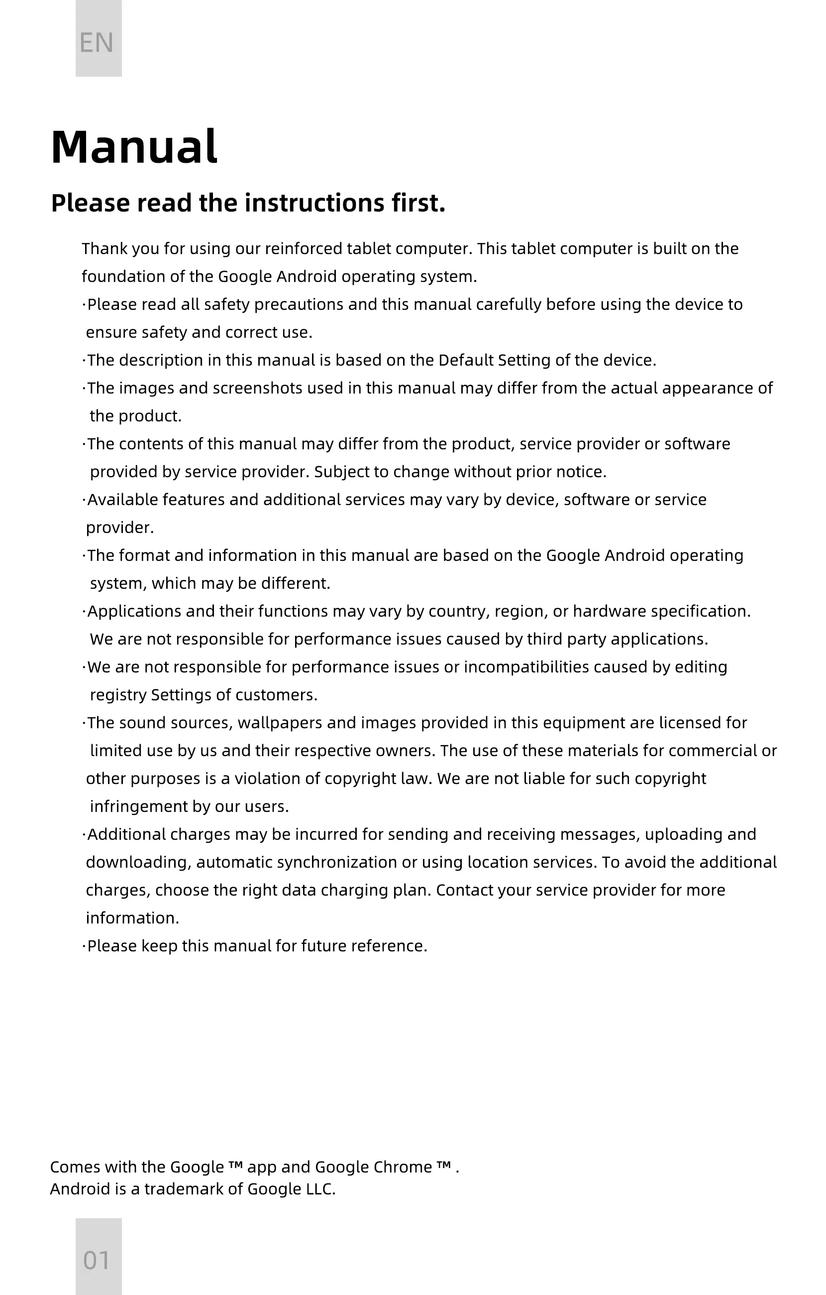 Thank you for using our reinforced tablet computer. This tablet computer is built on the