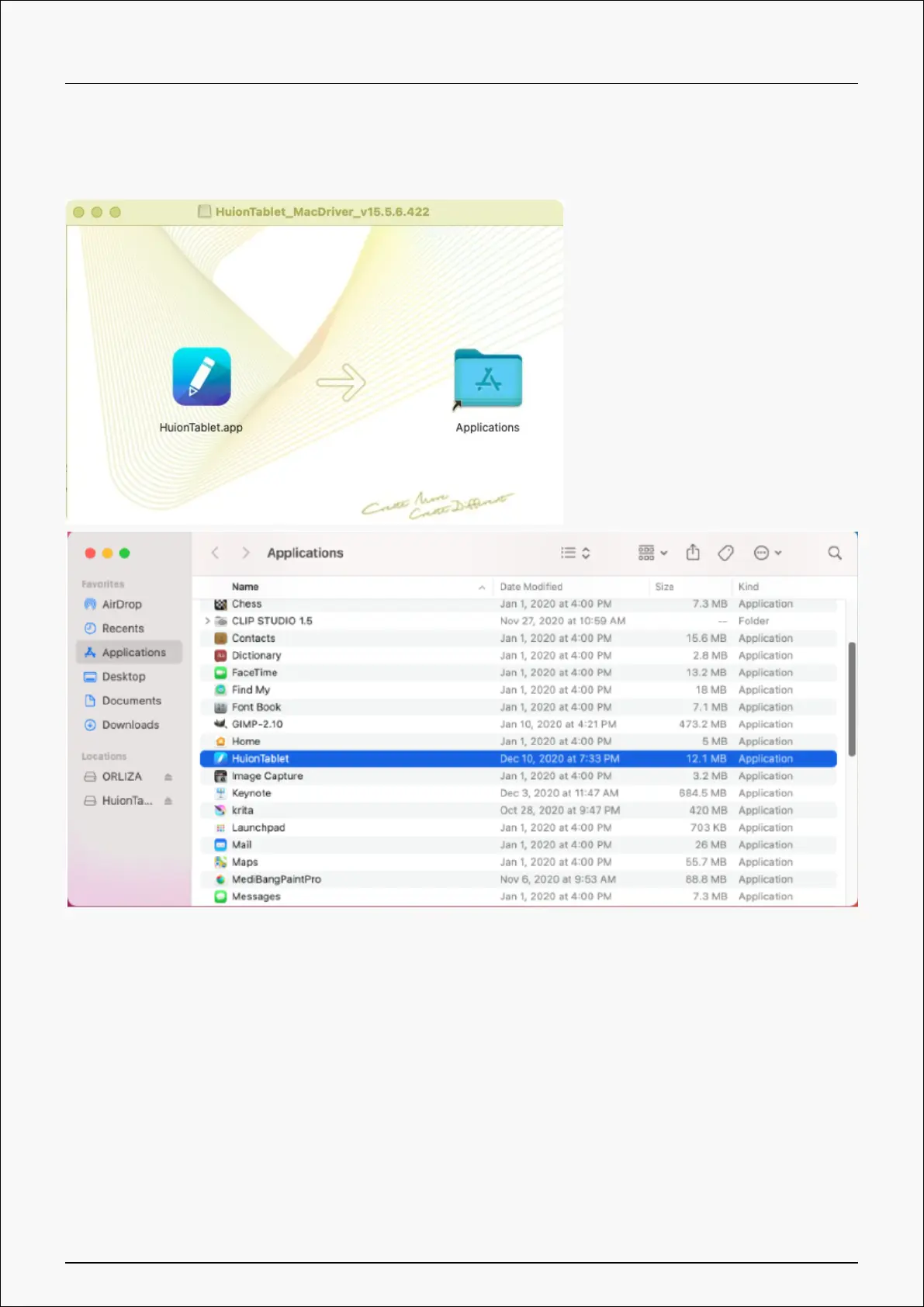 4. Unzip the driver file and drag the HuionTablet driver application into the “Applications”