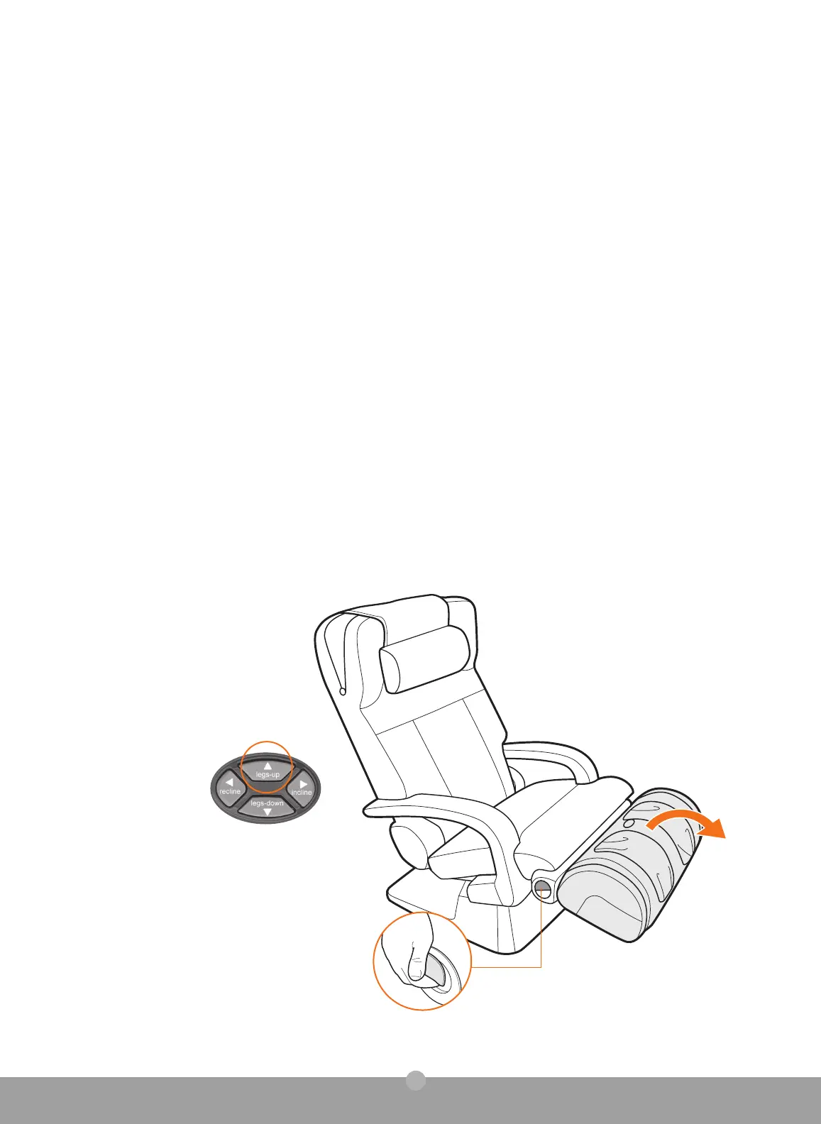 Assis dans le fauteuil, élevez le repose-pied à une position confortable à l’aide de la touche jambes élevées.