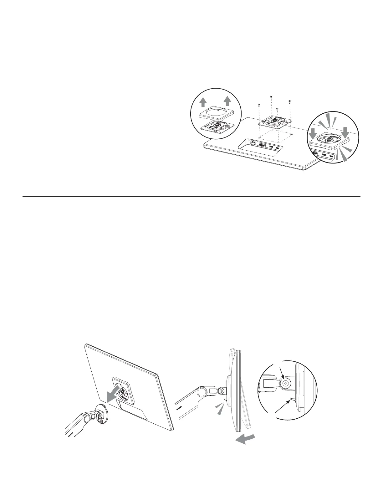 Hold the monitor angled back and lower it onto the arm. Fit the hook at the top of the