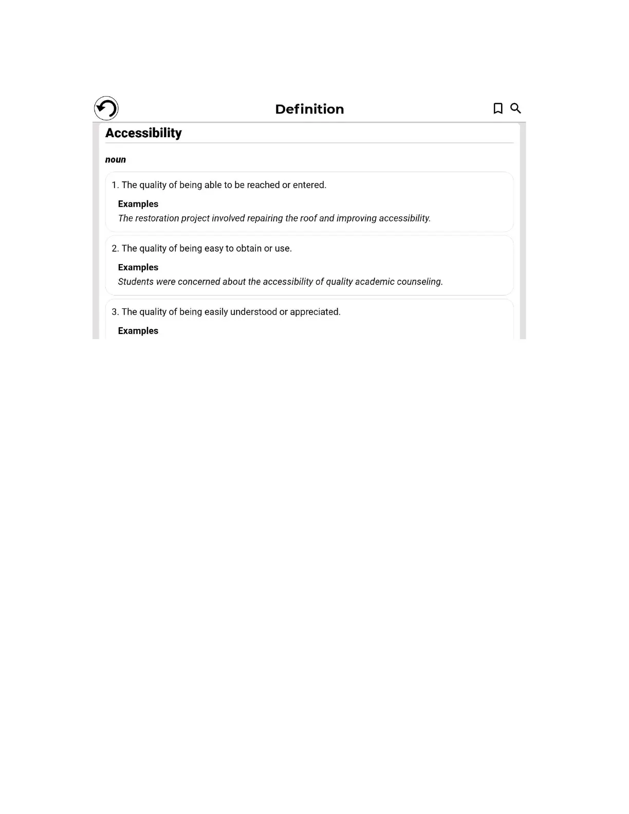 Users can save word definitions to a word list via the Bookmark icon at the top,