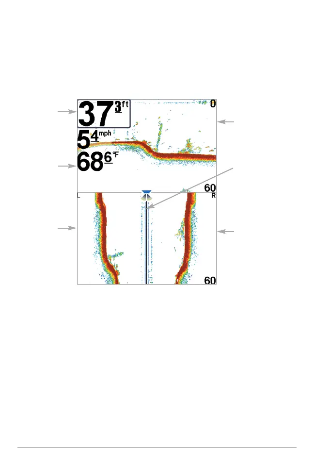 Classic layout: The top portion of the display presents a historical log of sonar