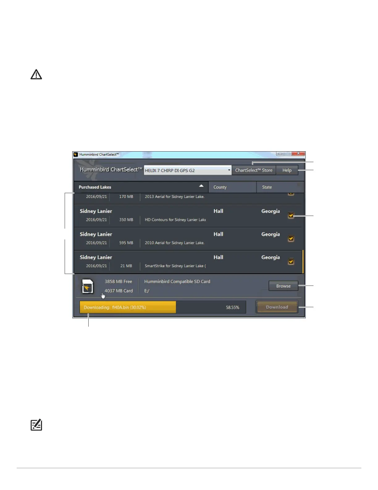 . Select LakeMaster Chart(s): Select the LakeMaster chart(s) you want to save to the SD or microSD card. Click inside the
