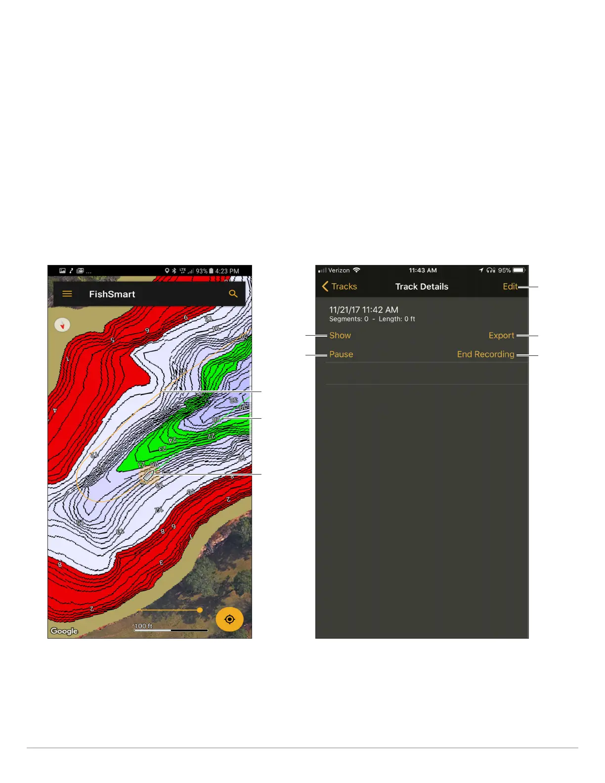 Google Android: Tap the FishSmart main menu. Select Tracks. Press and hold a track until it is highlighted, and tap the Trash