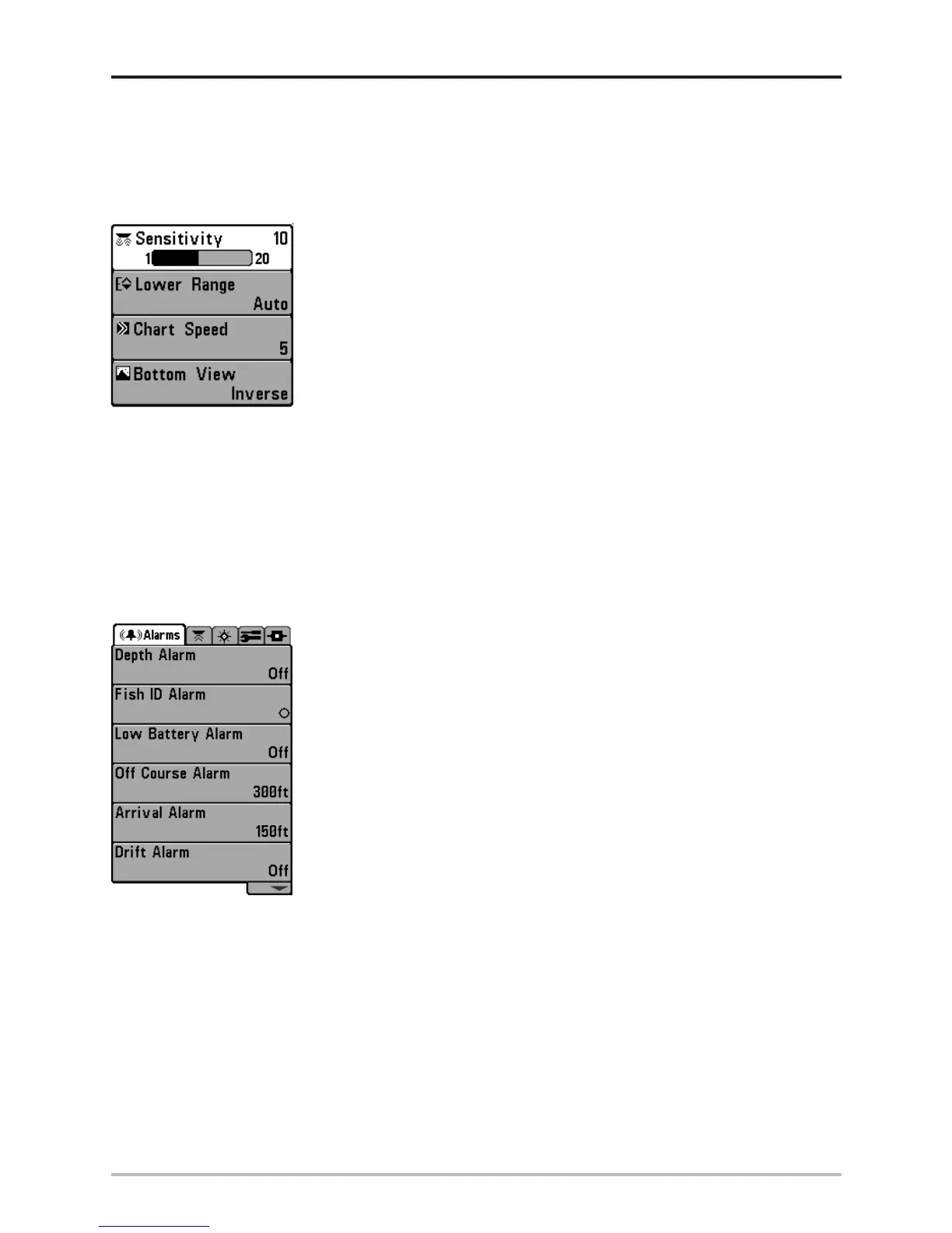 quickly: Alarms, Sonar, Navigation (if the GPS Receiver is attached), Setup, and Accessories.